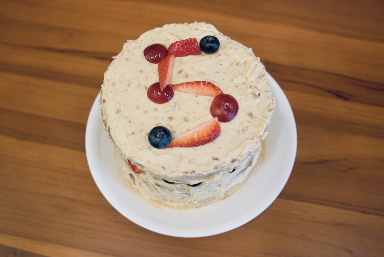 從女兒一歲生日開始決定自己做蛋糕,不知不覺做到了第五年。前三年幾乎沒放糖、少糖,今年有開放些,但也因為我妊娠糖尿病需追蹤最好繼續飲控,選了用杏仁麵粉取代一般麵粉的(英文)食譜。口味是純花生醬(成分只有花生加鹽的),基底也有香蕉不過不明顯。今年的蛋糕是五年來全家都喜歡,連口味重的先生都愛吃。三月寶寶每年生日都有新鮮草莓,是女兒的最愛,用莓果裝飾蛋糕。